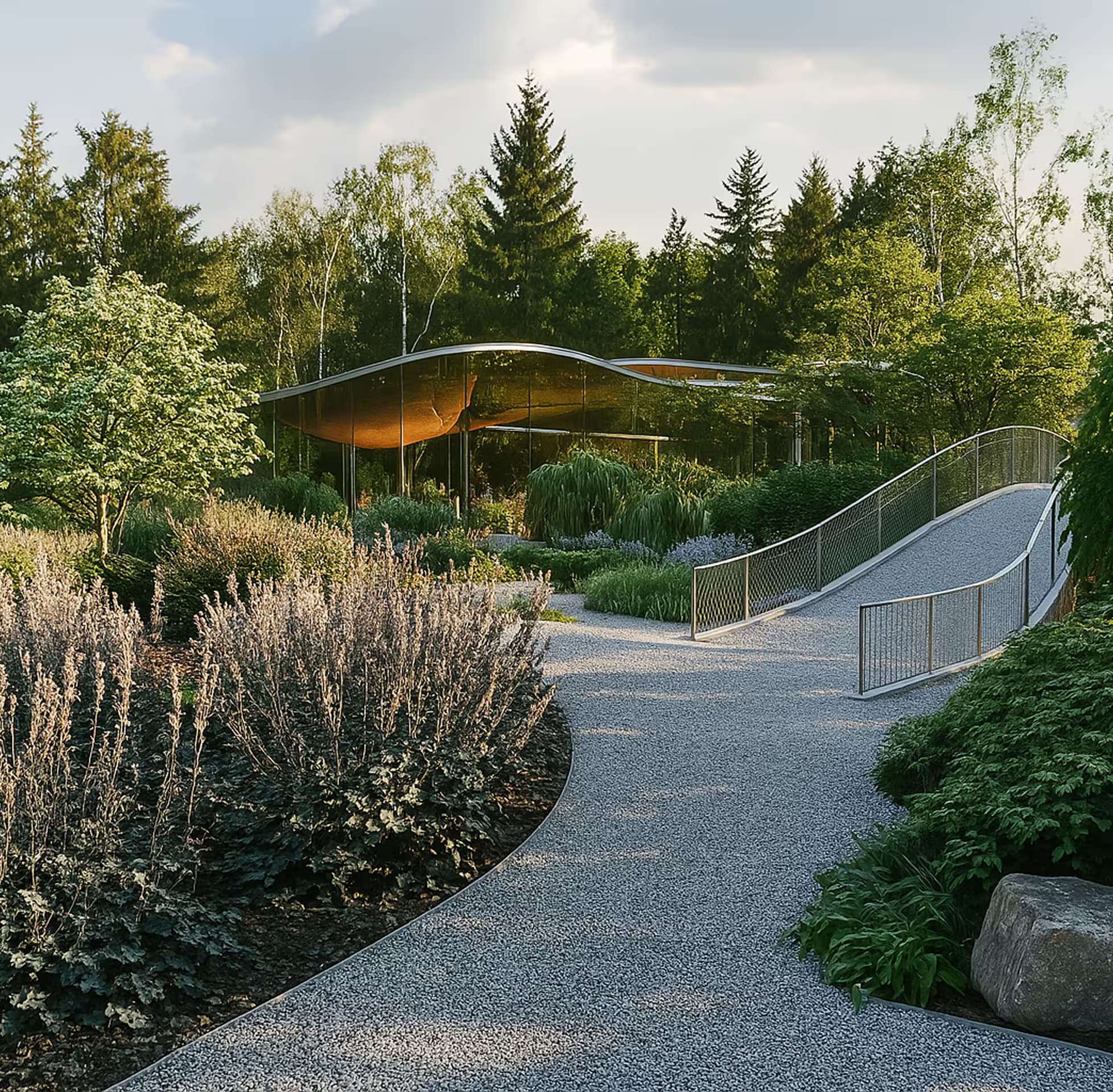 Идеальное место для созерцания и неспешных прогулок. 750 метров экотроп, зоны цветников и уединенные беседки для отдыха на природе.